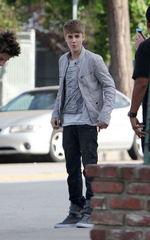 El cuerito de "Never Say Never" llegó primero a la recientemente inaugurada de Chick-fil-A, antes de ir a hacer una parodia de vídeo de su pelea con un grupo de matones - todo el tiempo mostrando su calzoncillos boxer color púrpura para que todos lo vean .
